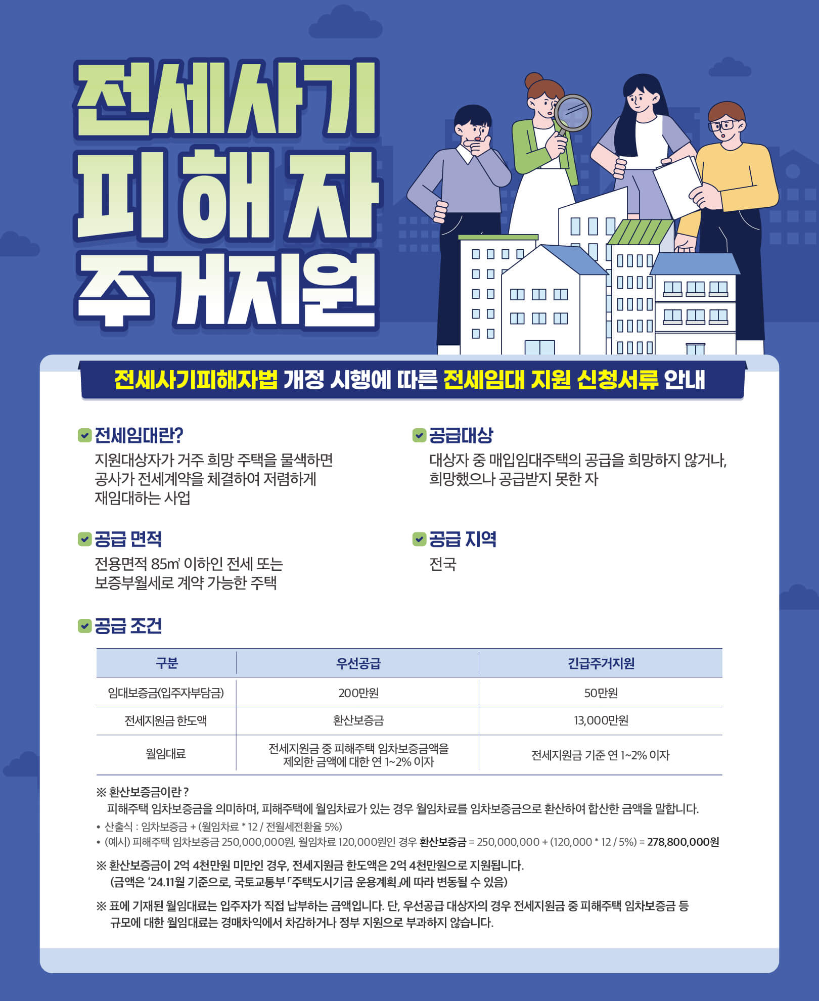 전세 사기 피해자로 인정된 피해자들을 위해 주거 안정을 위한 정책으로 지원 대상자가 거주 희망 주택을 물색하면 공사가 전세계약을 체결하여 저렴하게 재임대 해주는 정책이라고 합니다.