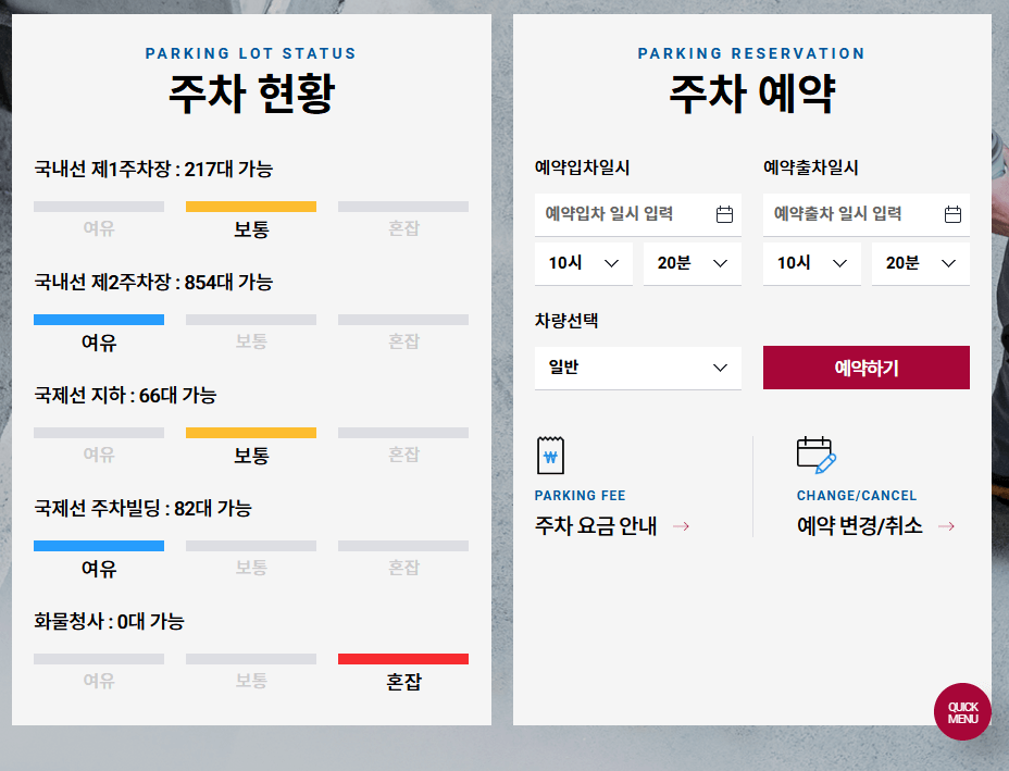 제2 주차장의 주차 예약 말고도 홈페이지를 방문하시면, 아래쪽에 주차장 현황을 바로 알 수 있습니다. 또한 바로 붙어서 주차 예약할 수 있는 섹션도 마련되어 있으니, 김포공한 홈페이지를 이용하시면 더 수월합니다.