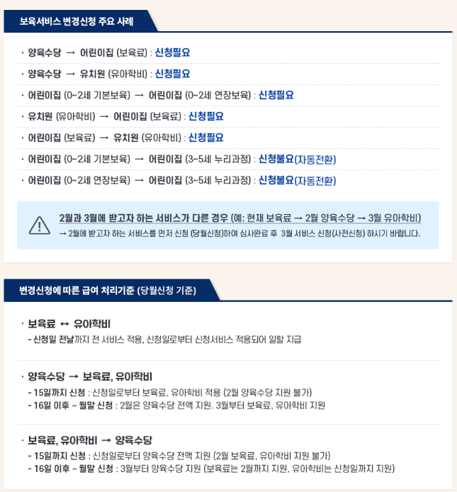 혹은 2월에 가정양육, 어린이집, 유치원으로 변경한다면 양육수당, 보육료, 유아학비로 당월신청 가능합니다.