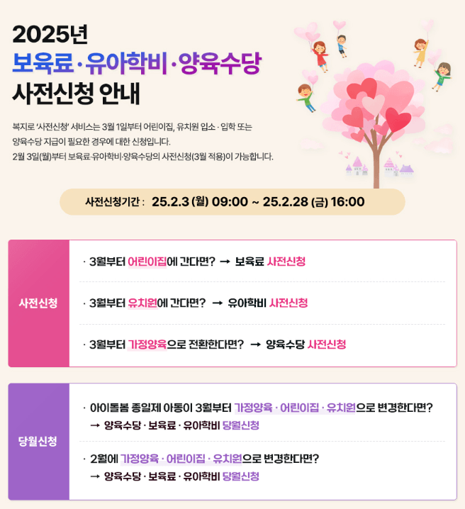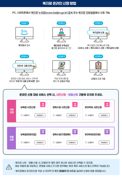 사전 신청으로는 어린이집 보육료, 유치원 유아학비, 가정양육 양육수당 신청이 가능합니다.