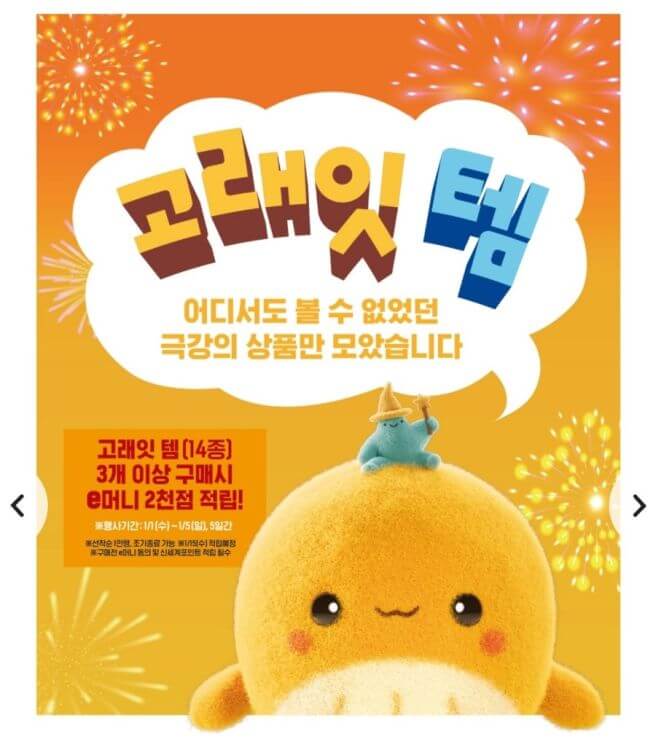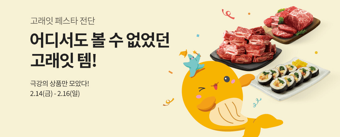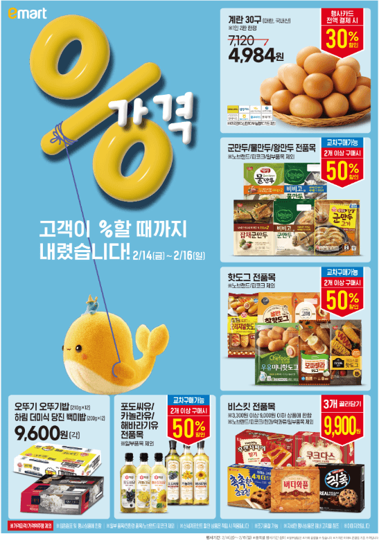 지난 1월 1일부터 5일까지 진행했던 전 고래잇 페스타가 큰 성공을 거두며 매출이 전년 대비 43% 증가하는 성과를 올렸다고 합니다. 이에 힘입어 2월 행사도 진행하고 있습니다만, 15일인 오늘을 기준으로 하루밖에 더 남지 않았으니 장보기를 미루셨던 분들은 하루빨리 이마트에 방문하여 득템을 하시기 바랍니다.