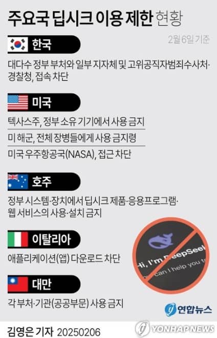 최근 한국뿐만 아니라 여러 국가가 정부 소유 기기에서의 딥시크 사용을 금지하고, 미국은 정부 기관에서 딥시크를 사용하지 못하게 하는 법안을 조만간 발의하겠다고 나선 데 따른 조치로 풀이됩니다.