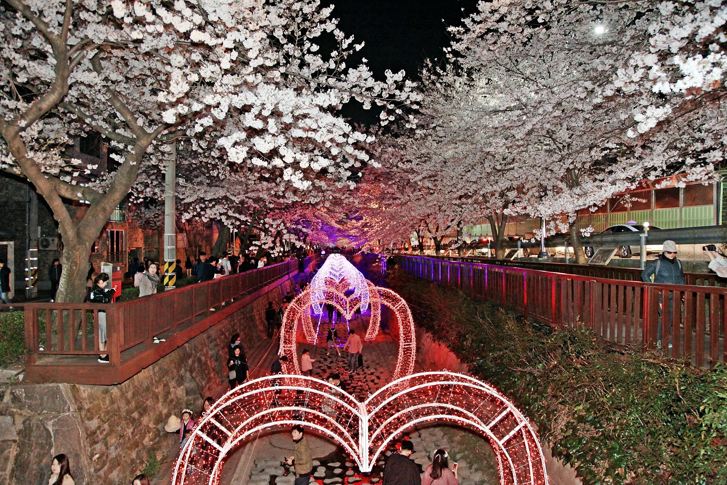여좌천은 드라마 '로망스'의 촬영지로 유명하며, 약 1.5km의 벚꽃 터널이 장관을 이룹니다. 특히, 군항제 기간에는 다양한 포토존이 마련되어 있어 추억을 남기기에 좋습니다.