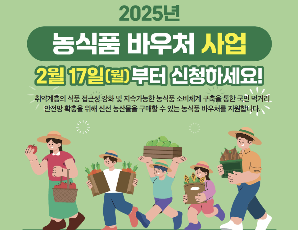 농식품 바우처는 취약계층의 식품 접근성을 강화하고, 지속 가능한 농식품 소비 체계를 구축하여 국민 머거리 안전망을 확충하기 위한 제동비니다. 2025년부터 이 제도는 전국적으로 화대 되어 더 많은 가구가 혜택을 받을 수 있게 되었습니다.