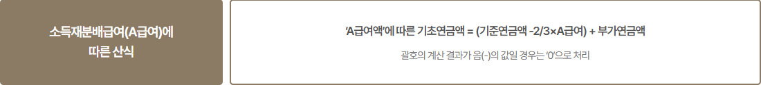 위의 경우에 해당하지 않는 분들의 기초연금액은 「소득 재분배급여(A급여)에 따른 산식」 또는 「국민연금 급여액」등을 고려하여 산정됩니다.