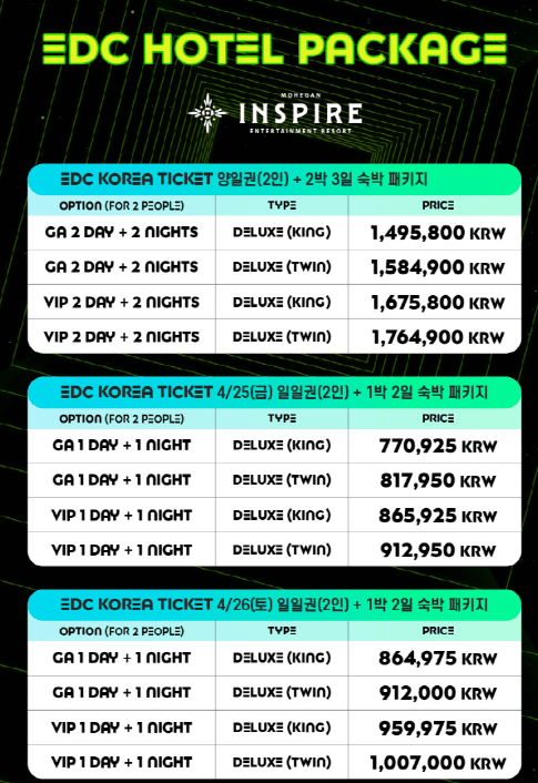 EDC Korea는 페스티벌 티켓뿐만 아니라 인스파이어 호텔과 함께 예약할 수 있는 포텔 패키징도 판매하고 있습니다.