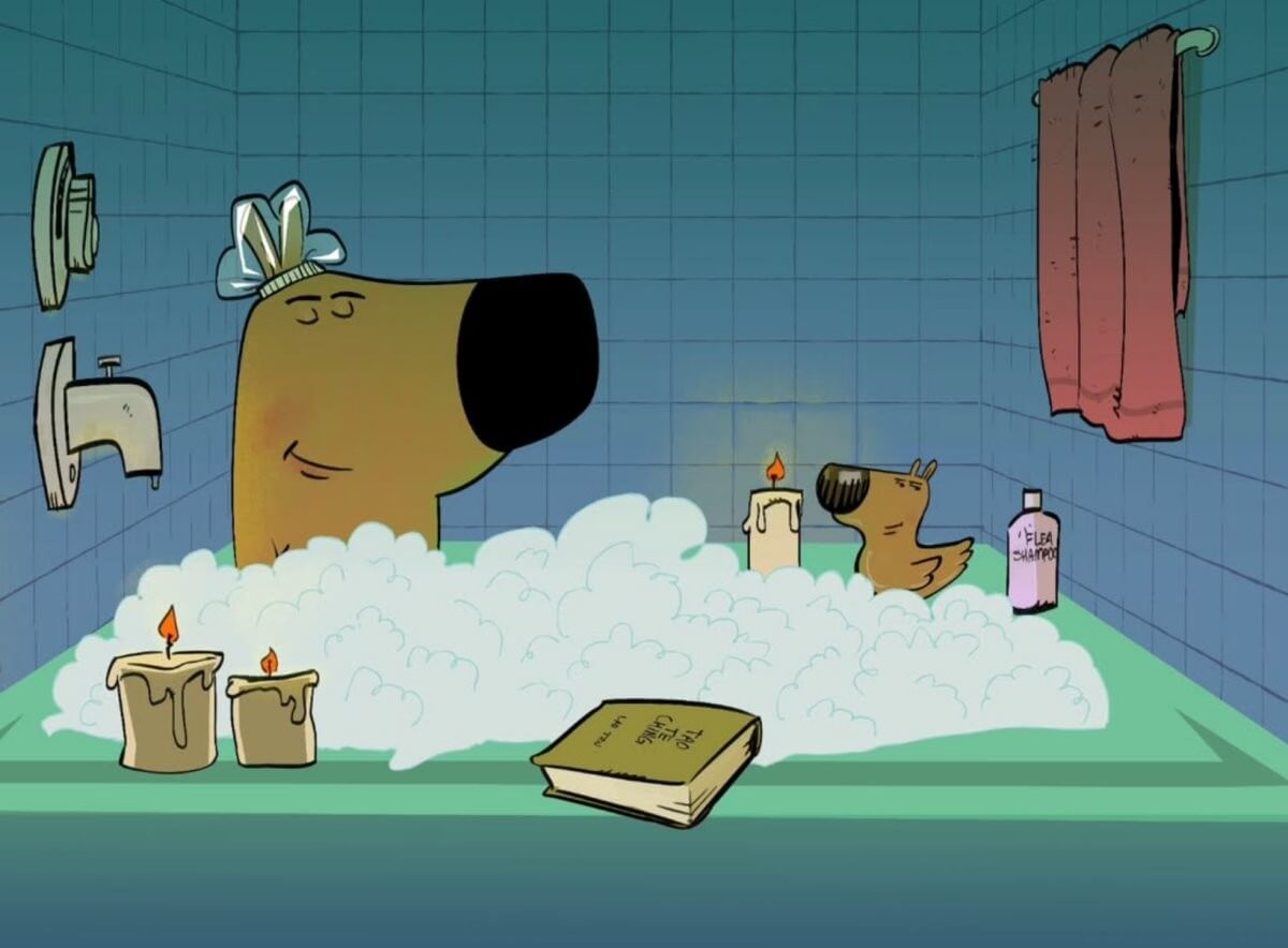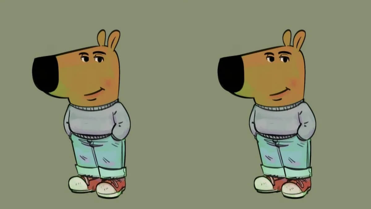 이 캐릭터는 청바지에 스웨터를 입고 빨간 운동화를 신은 갈색 강아지의 모습으로, 느긋하고 여유로운 표정을 짓고 있습니다.