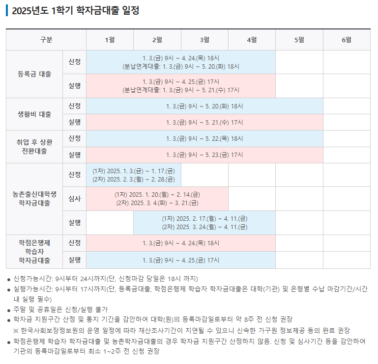 등록금 대출은 4월 24일(목)까지, 생활비 대출은 5월 20일(화)까지 실행해야 합니다.