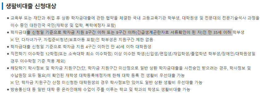 학자금 대출 신청일 기 준으로 학자금 지원 8구간 이하 또는 9구간 이하 (긴급생계곤란자로 서류 확인이 된 자)인 만 35세 이하 학부생